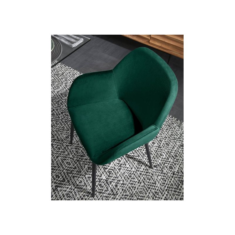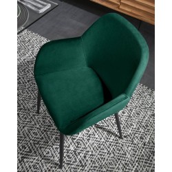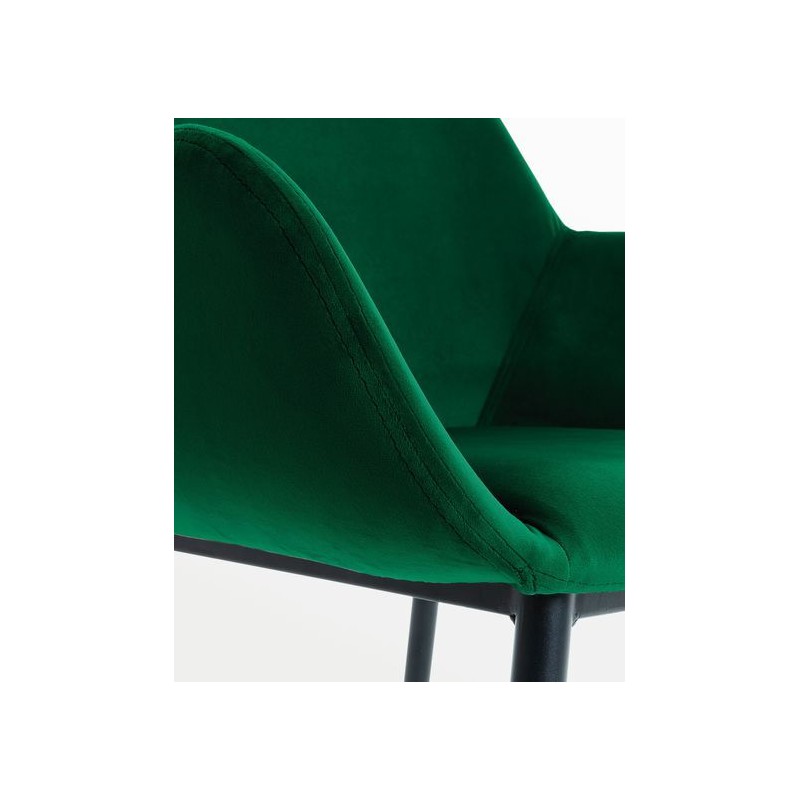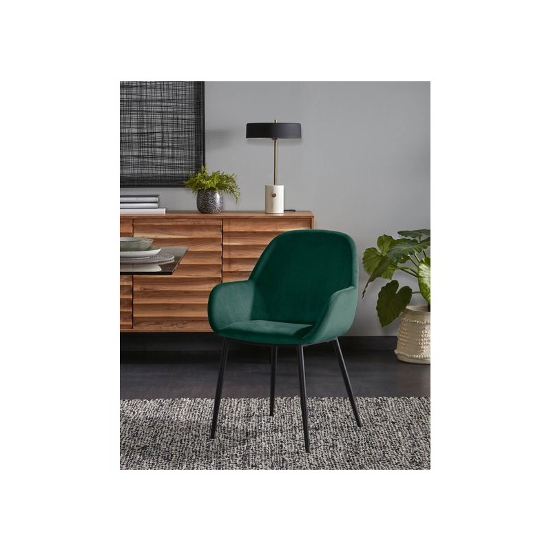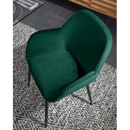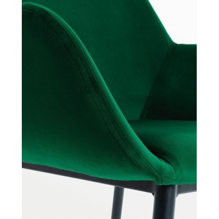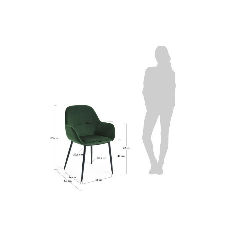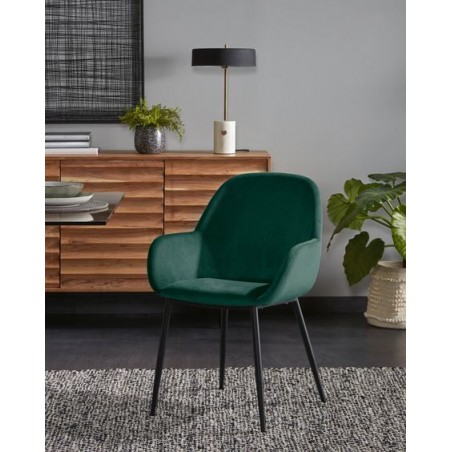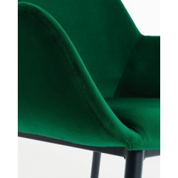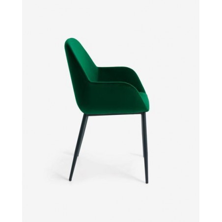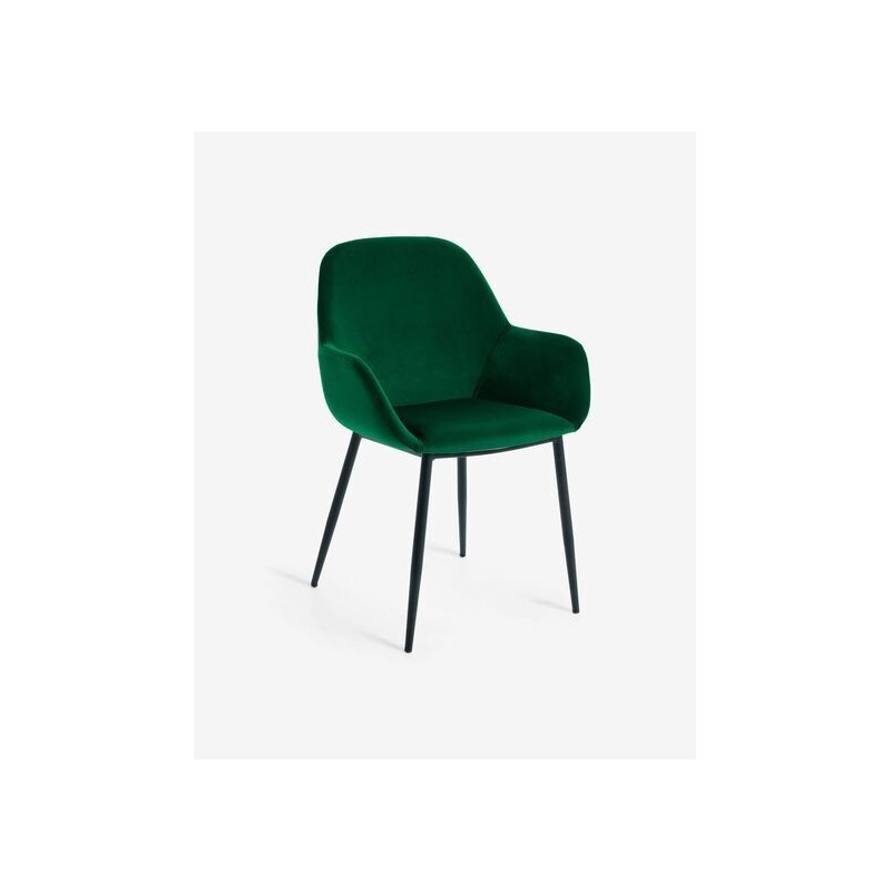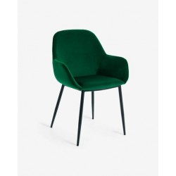 Diferentes tonalidades, tejidos, color de patas..., múltiples variedades podrás encontrar en la colección de sillas para comedor modelo Kun . En este caso te presentamos el modelo fabricado en tejido de terciopelo verde, con estructura rellena de espuma que ofrece un confort inmejorable y una sensación de relax que no querrás perderte. También la definimos como resistente y duradera gracias a sus patas fabricadas en acero acabado en color negro.