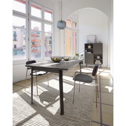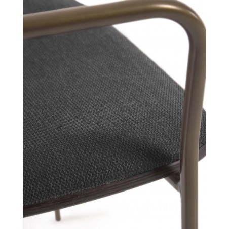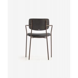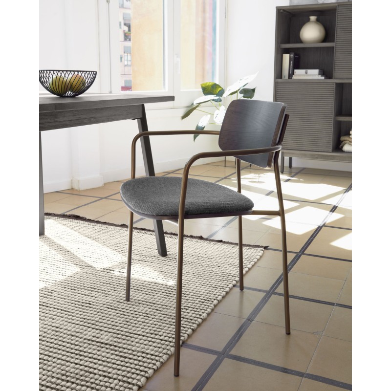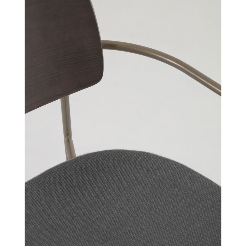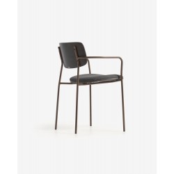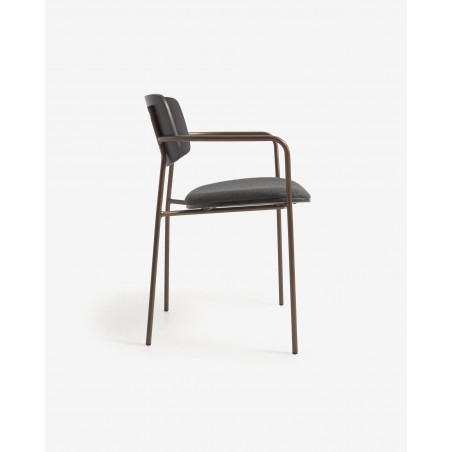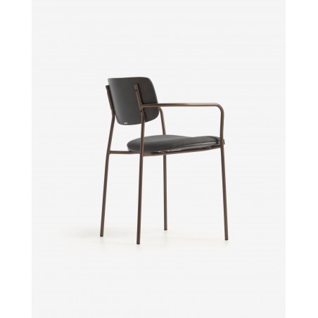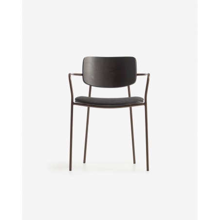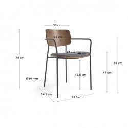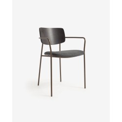 Si tu preocupación es buscar una silla que no se manche fácilmente Maure es la tuya, una silla con tratamiento antimanchas para que no tengas que preocuparte si se te cae el café o el vino, es muy práctica tanto para comedor o cocina. Tiene una estructura en metal con acabado latón y un asiento y respaldo en chapa de fresno oscuro, para un mayor confort consta de un cojín en el asiento acolchado de espuma.