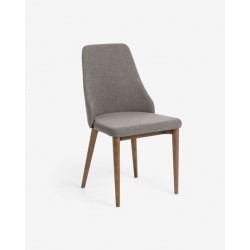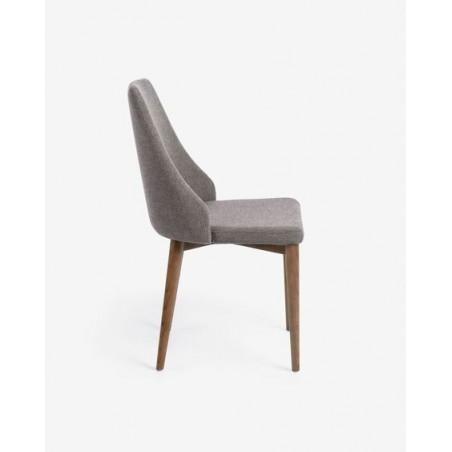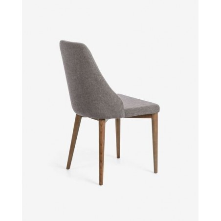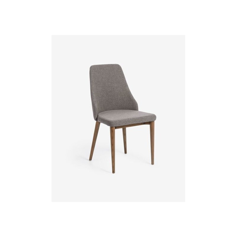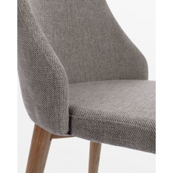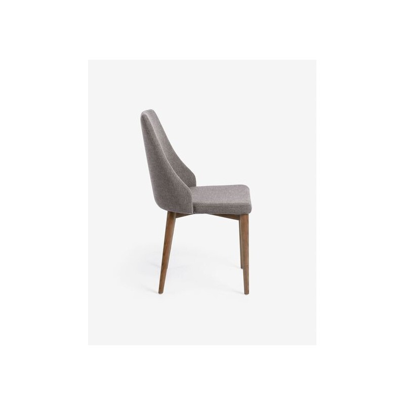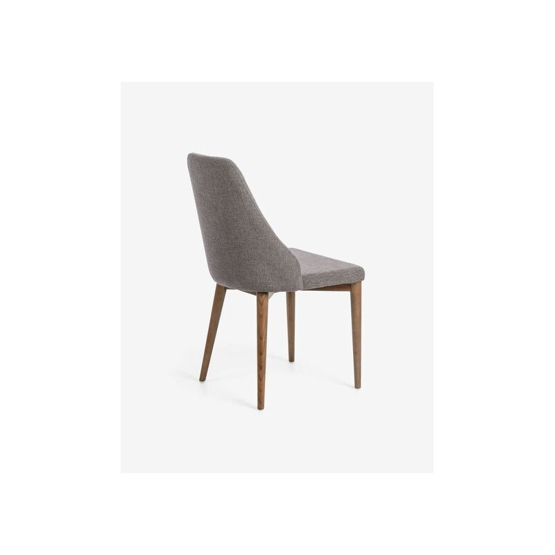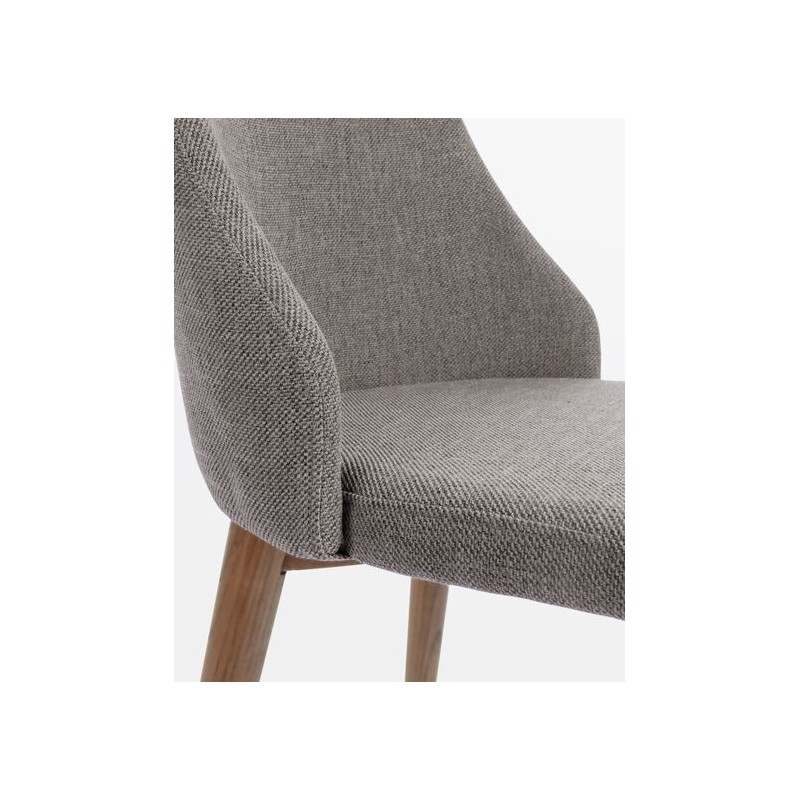 La silla de comedor modelo Rox está compuesta por una estructura contrachapada de bajas emisiones, tiene un asiento y respaldo acolchado y rellenos de espuma. Está tapizada en tejido color gris claro, un tejido antimanchas que facilita su mantenimiento y permite un uso diario intensivo. Consta de cuatro patas que le dan una sujeción de hasta 120 kg, fabricadas en madera de fresno color oscuro.